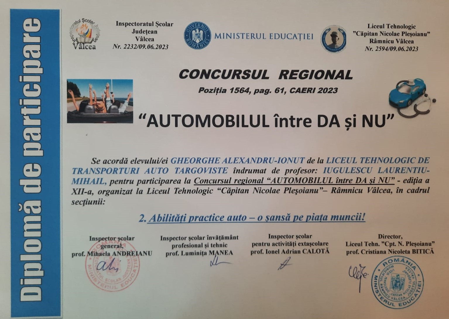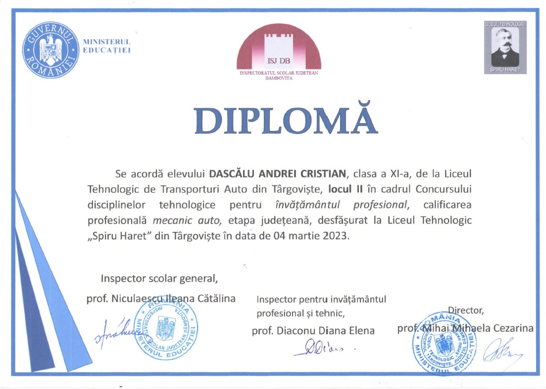 | Dascălu Andrei Cristian | a XI-a | Mecanic auto | Locul II |