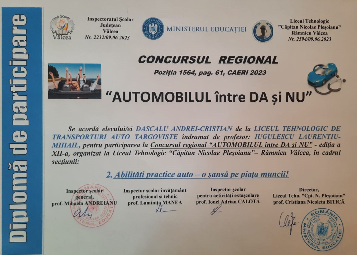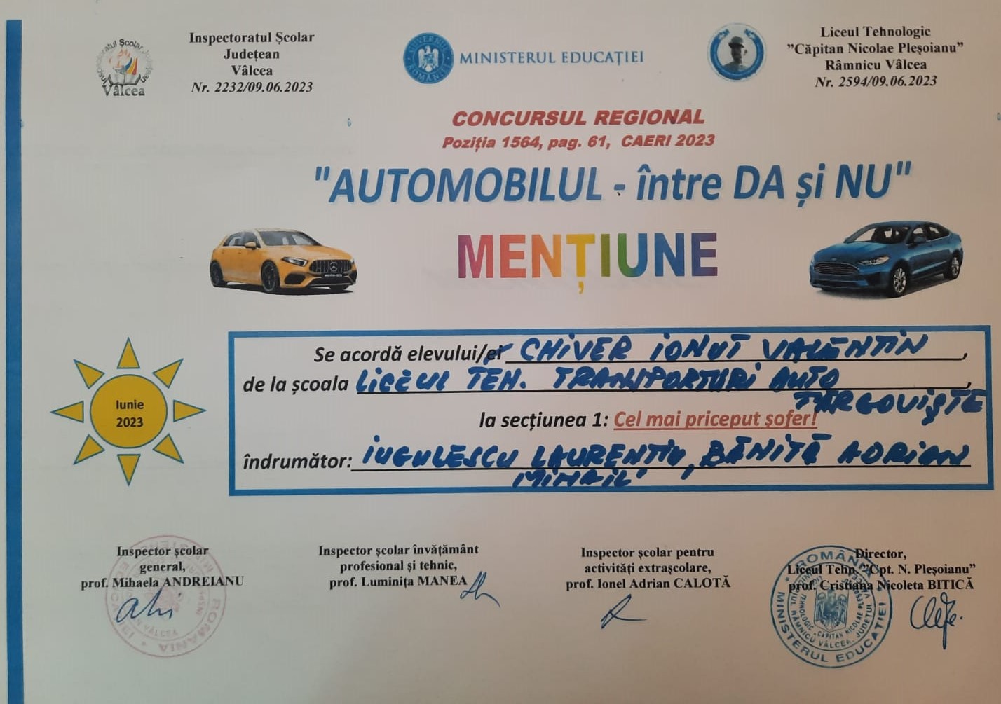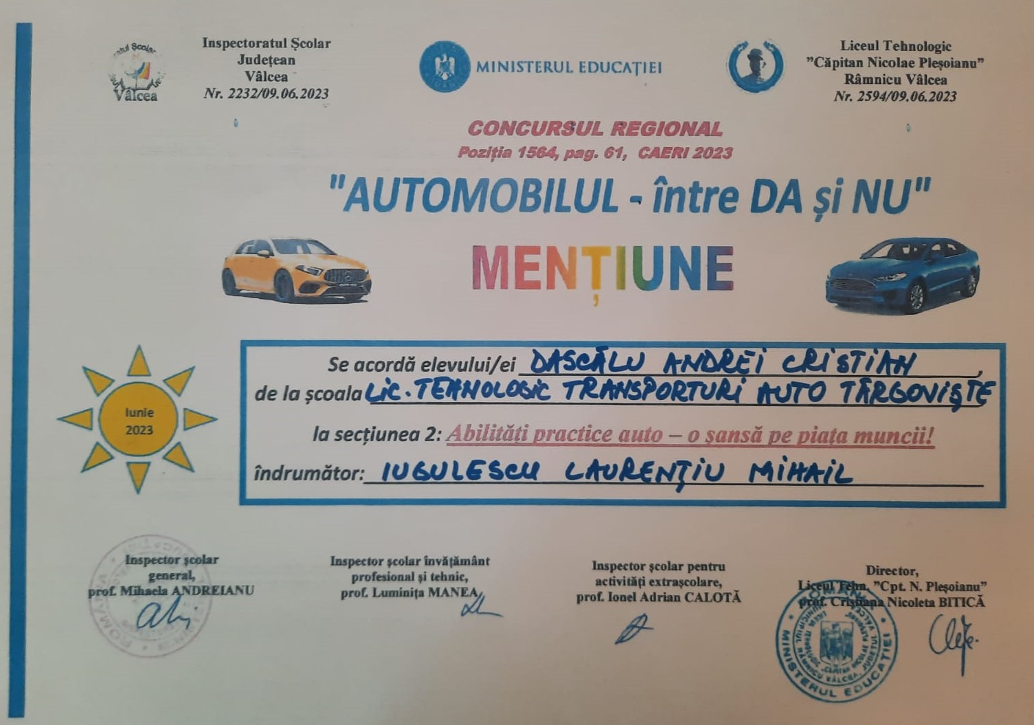 | Dascălu Andrei Cristian | Abilități practice auto - o șansă pe piața muncii! | Mențiune | Iugulescu Laurențiu Mihail |