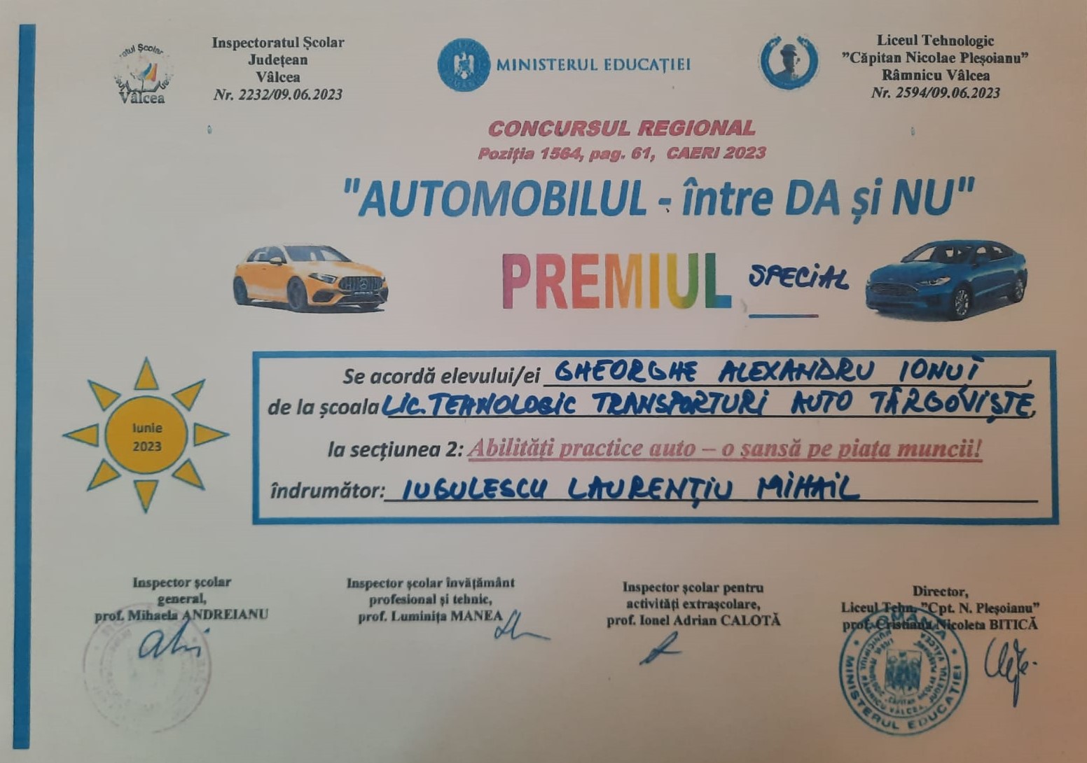 | Gheorghe Alexandru Ionuț | Abilități practice auto - o șansă pe piața muncii! | Premiul Special | Iugulescu Laurențiu Mihail |